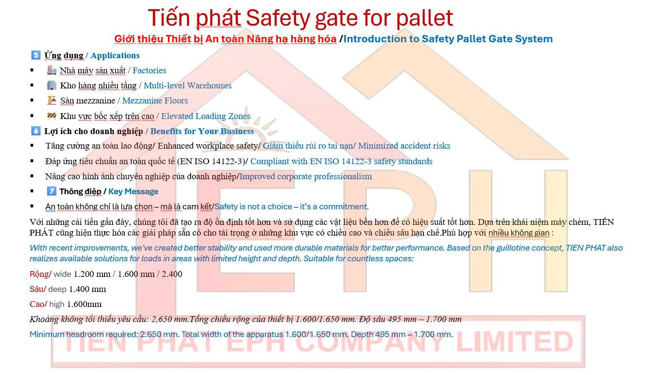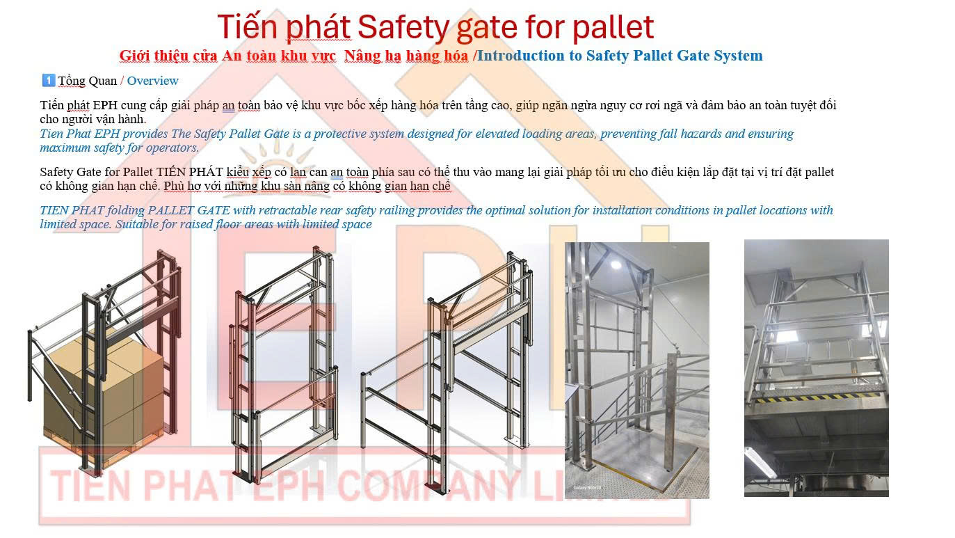 Tiến phát EPH cung cấp giải pháp an toàn cho hệ thống của chuyển hàng vào tầng lửng của máy sản xuất . Lắp đặt tại vị trí đặt tải của Palet trên tầng lửng