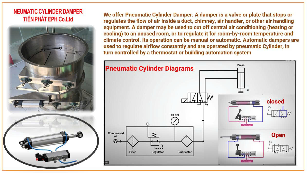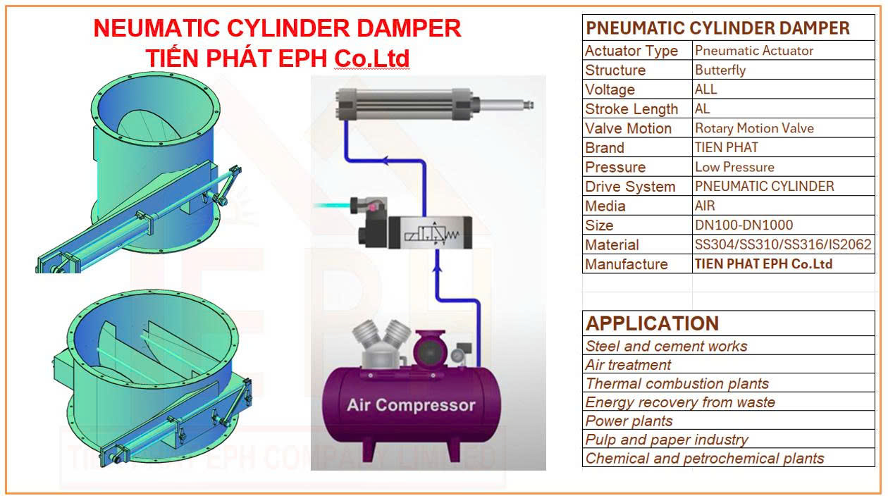 Van điều tiết Không khí dẫn động khí nén Tiến Phát là thiết bị điều chỉnh hoặc chặn luồng gió trong hệ thống HVAC, ống dẫn khí và các thiết bị xử lý không khí. Van được vận hành bằng xi lanh khí nén, có thể điều khiển bằng tay hoặc tự động, giúp kiểm soát lưu lượng từng khu vực một cách hiệu quả, ổn định và tiết kiệm năng lượng.